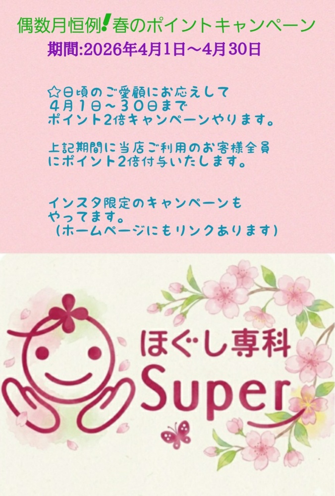 日頃のご愛顧にお応えして4月1日~30日までポイント2倍キャンペーンやります。上記期間に当店ご利用のお客様全員にポイント2倍付与いたします。 またインスタ限定のキャンペーンもやってます。2026年4月1日~30日までにご利用のお客様で当店のInstagramフォローの上このクーポンをご提示頂いた方全員に来店ポイント3倍付与致します!この機会に是非ご利用ください!※InstagramのリンクはTopページにあります🎵