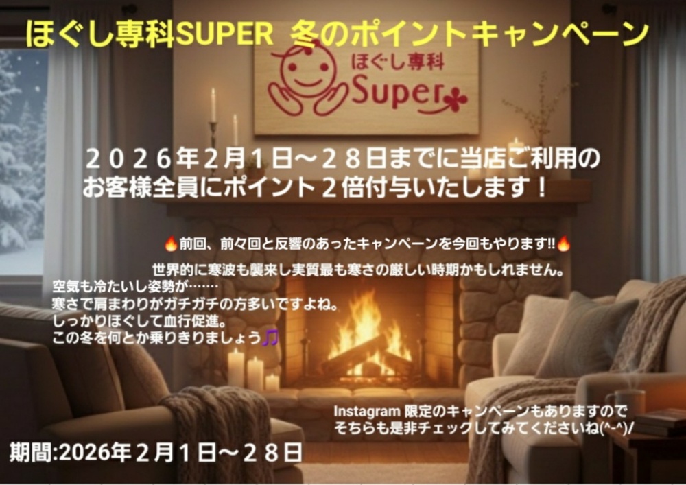 ご好評につきまた今年もポイントキャンペーンやります🔥2026年2月1日~28日までに当店ご利用のお客様全員にポイント2倍付与いたします! 世界的に寒波も襲来し実質最も寒さの厳しい時期かもしれません。寒さで肩まわりがガチガチの方多いですよね。しっかりほぐして血行促進。この冬を何とか乗りきりましょう🎵 Instagram 限定のキャンペーンもありますのでそちらも是非チェックしてみてくださいね(^-^)/